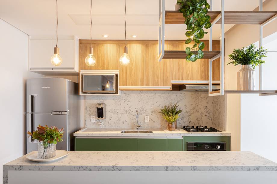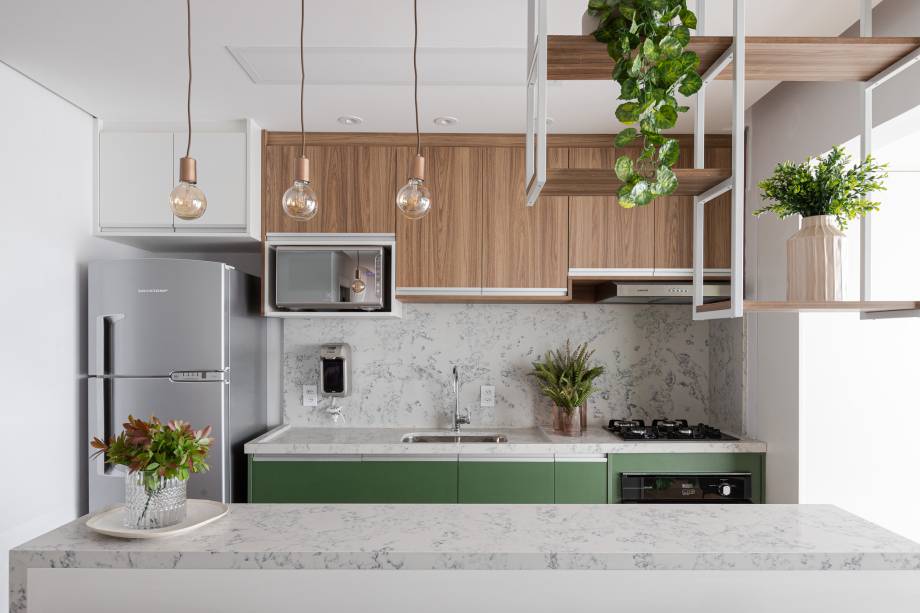 Na cozinha, a escolha do MDF verde traz um toque de cor que se conecta com os outros elementos do ambiente, enquanto a bancada em Silestone Carrara adiciona sofisticação e harmonia.
