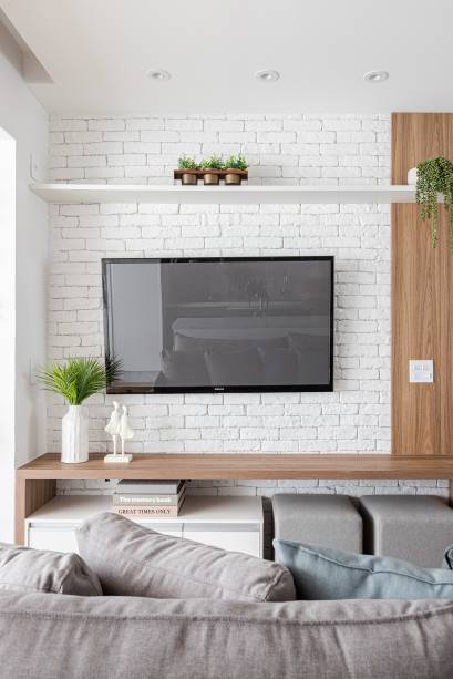 No living, a combinação de texturas, como o tijolinho na parede e o sofá acolhedor, criam uma atmosfera clean e convidativa, perfeita para momentos de convivência e descanso.