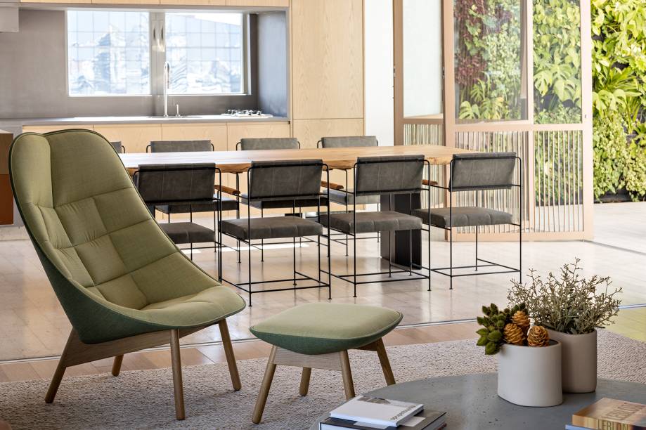 Na cozinha, a escolha do ladrilho verde para o revestimento do piso em da meia parede dialoga com a marcenaria de laca de tom semelhante. “Já nos mobiliários, brincamos com contrastes entre diferentes texturas e cores, que aparecem pontualmente no sofá Benjamin, do De Carvalho e na poltrona Uchiwa da HAY”, finalizam as arquitetas.