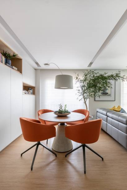 A base neutra combinada com toques de cor em vários momentos, traduz a energia do casal, como o vibrante laranja das cadeiras chiara, que agrega vigor ao jantar.