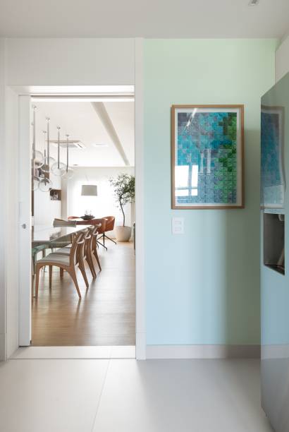 Adentrando pelo hall privativo do andar, a elegância acolhe os visitantes. Apesar de compacto, os espelhos ampliam o espaço e refletem a luz, contribuindo para a sensação de amplitude. O uso de painéis amadeirados traz sofisticação e cria uma atmosfera calorosa.
