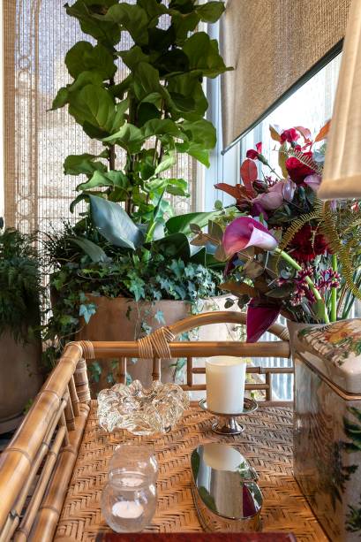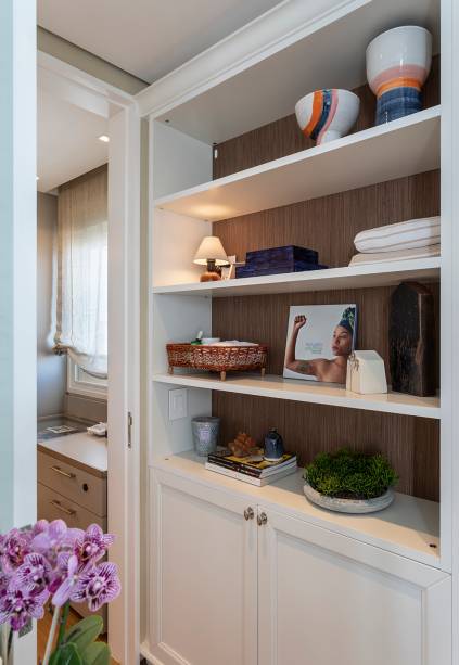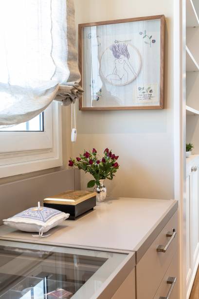 Apaixonado pela arte, Felipe não deixou faltar a arte popular brasileira na decoração, representada em objetos e peças de artesanato de comunidades espalhadas pelo Brasil. O grande destaque é a tela de Burle Marx, pensada e posicionada estrategicamente para ser apreciada por quem chega e por quem está na sala. O apartamento conta ainda com obras de Mariana Palma, Volpi e muitos outros artistas.