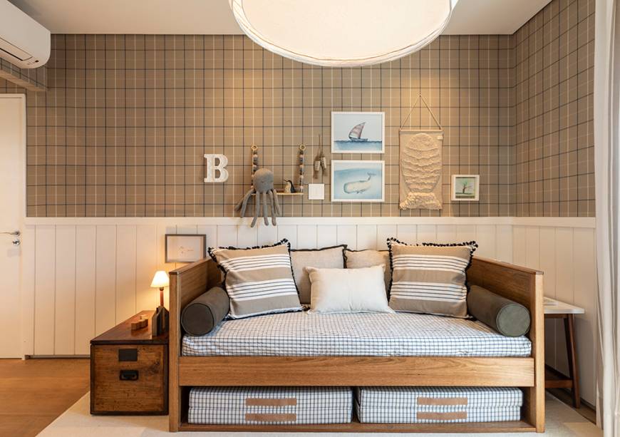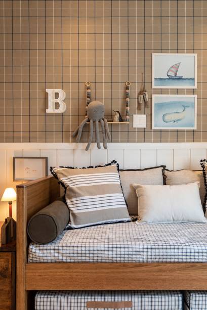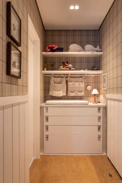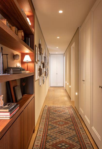 Por último, mas não menos importante, o corredor íntimo que leva para os quartos ganhou uma parede cheia de memórias e recordações nas mais diversas fotos de fases distintas da vida da família, parentes e amigos. Trata-se de um espaço regado a memórias essenciais e um ar de nostalgia gostoso.