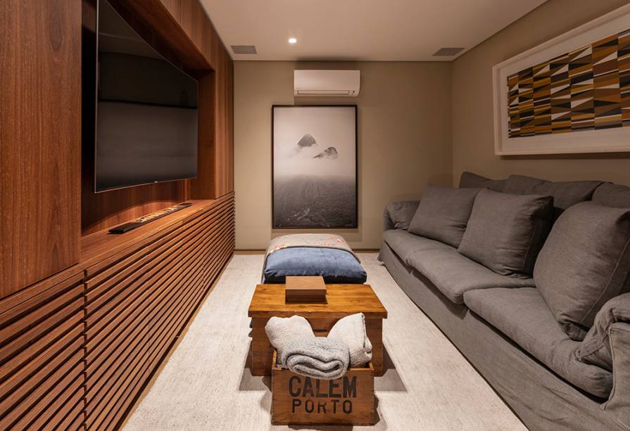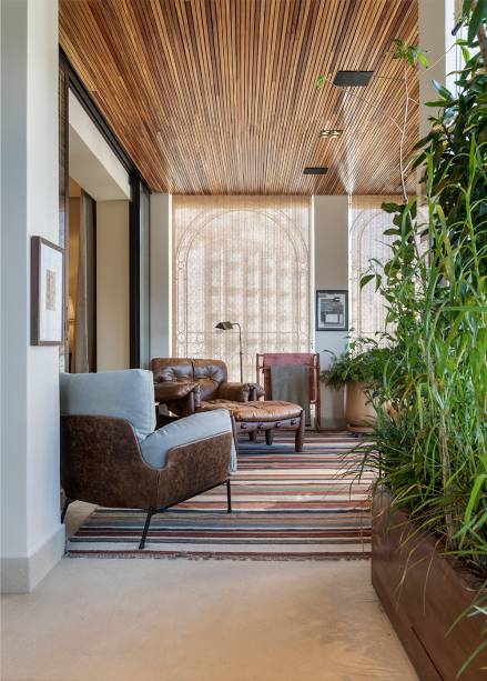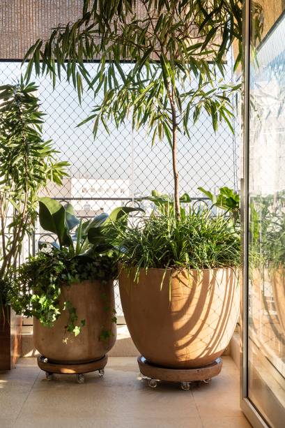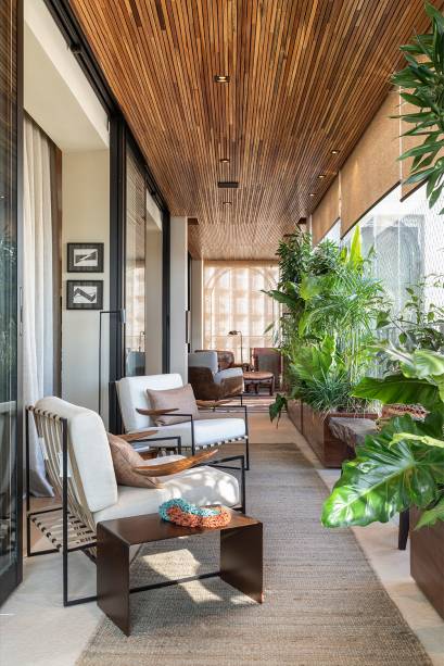 A varanda foi pensada para ser um espaço de convívio. Batizada de “sala do vinho” e “sala do pôr do Sol”, ela funciona como uma extensão integrada às salas. Neste espaço, era importante ter um projeto de paisagismo – o qual foi feito por Rodrigo Oliveira – para deixar tudo mais verde. A irrigação das plantas foi automatizada, assim como toda a iluminação.