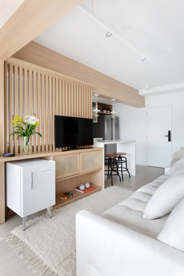 Eles abusaram das texturas para ativar o lado sensorial da moradora e criaram cômodos claros, abertos e aconchegantes. Um exemplo é o ripado em madeira clara que cria uma separação da cozinha para a sala, mas ainda sim mantém as duas integradas, além do revestimento das vigas existentes com a mesma madeira.