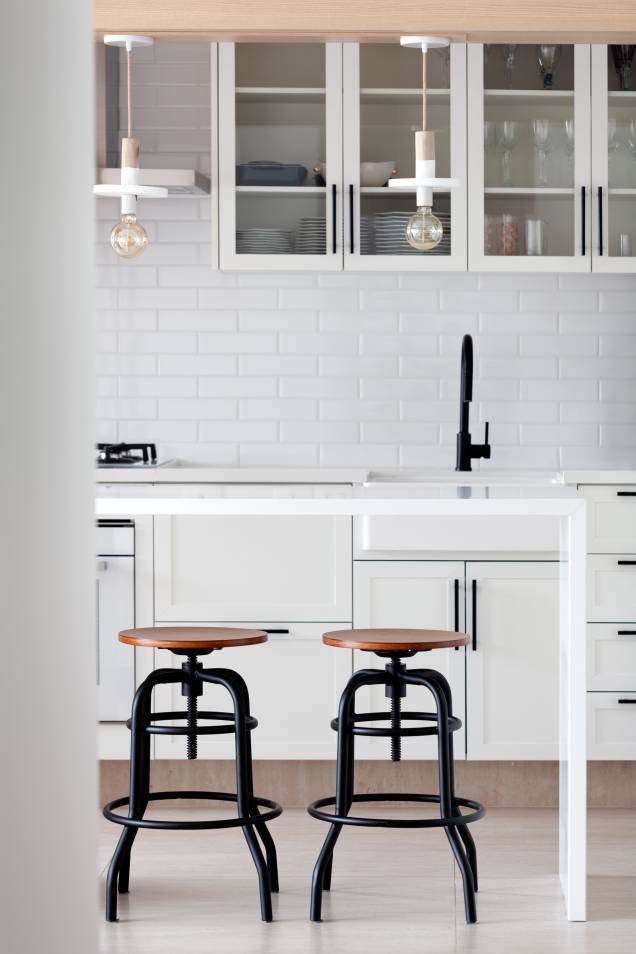 “Criamos um ambiente de leitura na varanda com um balanço e parede verde, onde a moradora pode ler com vista para o pôr do sol. Na cozinha, seguimos com materiais claros e com uma cuba estilo farm, trazendo um aconchego a mais. Já nos quartos, entramos com tijolinho branco rústico, trazendo textura para a cabeceira e, no banheiro com o maior clima spa, revestimos as paredes com seixos claros”, contam.