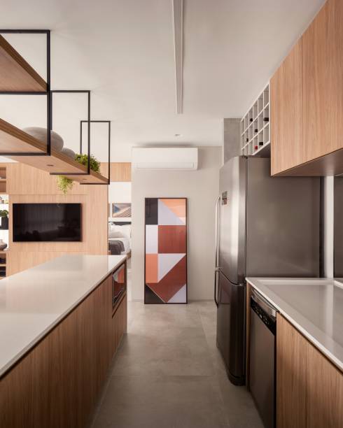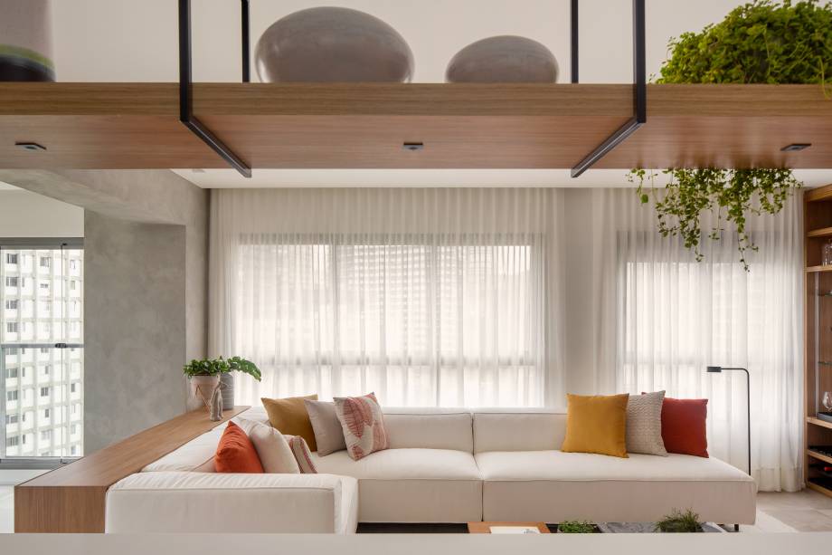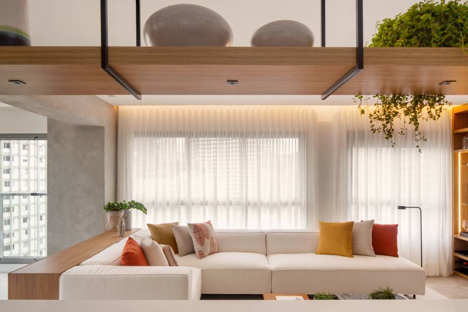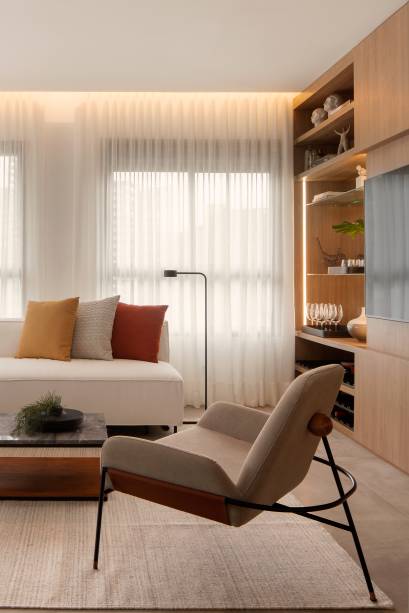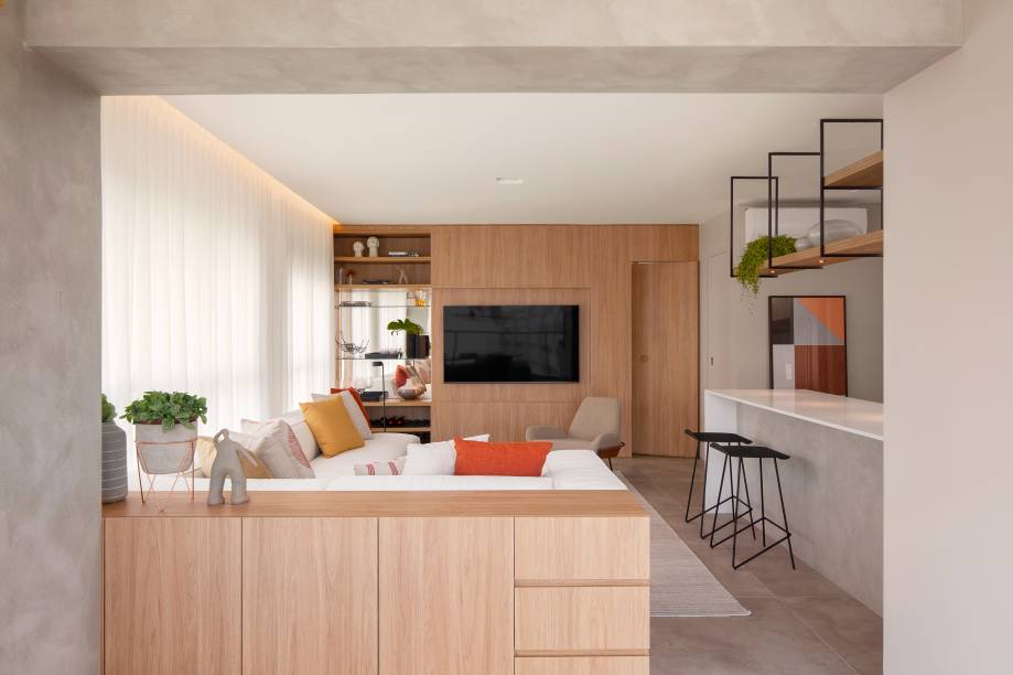 A decoração tem um estilo clean, com tons neutros e acolhedores. A marcenaria combina tons de MDF claros, conferindo aconchego. Já o piso que cobre todo o apartamento é de porcelanato.