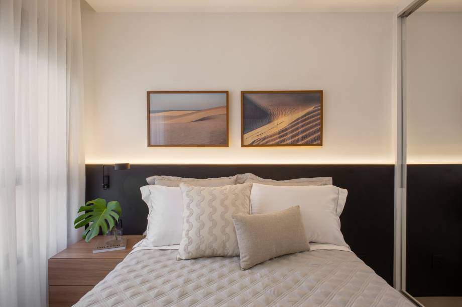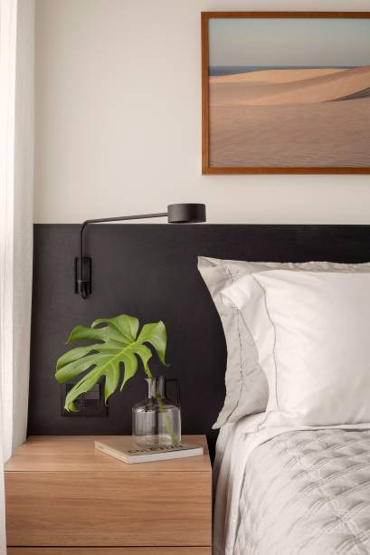 Para a área íntima foram criados um closet com portas de correr, uma cabeceira preta em MDF e também um local para TV, sapatos e prateleiras.