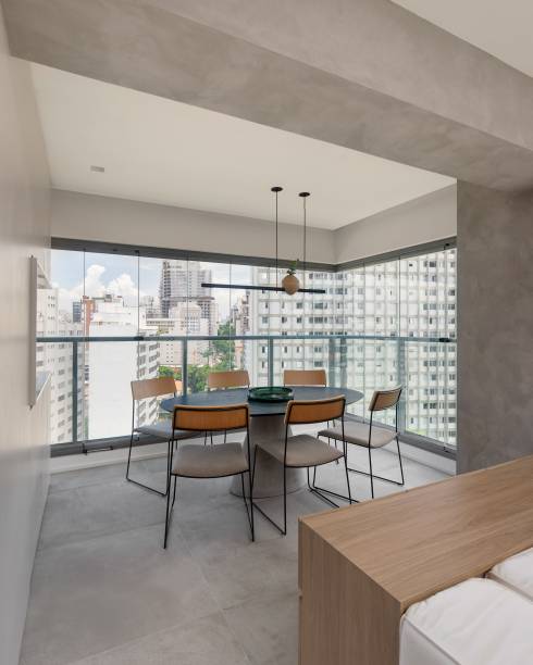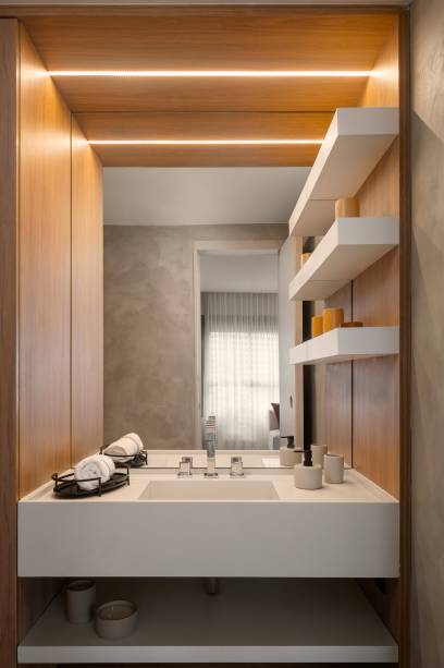 Segundo os profissionais, a questão central foi trazer sofisticação para uma área reduzida. “O Grande desafio desse projeto foi conseguir pensar em um apartamento com um tamanho pequeno que ao mesmo tempo tivesse a sofisticação para atender um cliente exigente e fosse durável e resistente, mas ao mesmo tempo viável economicamente para locação”, contam.