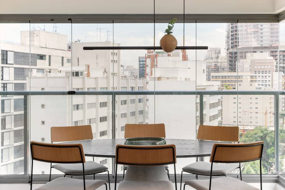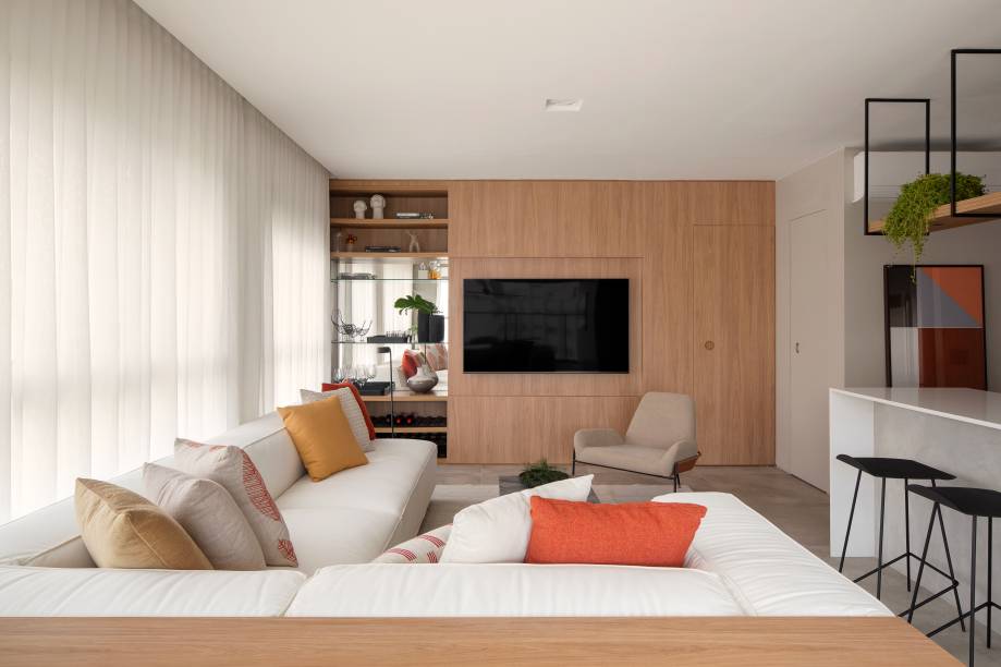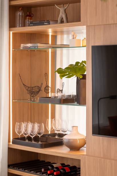 O destaque fica para o antigo terraço, transformado em sala de jantar com espaço gourmet e churrasqueira. Isso permitiu que a área do living e sala de tv ficasse mais ampla. Ali, junto da poltrona e sofá super confortáveis, ficam um bar com iluminação LED e um cantinho para os vinhos.
