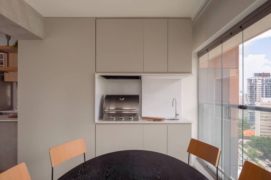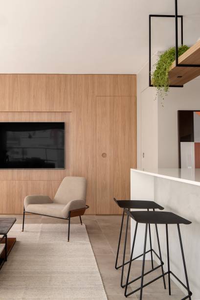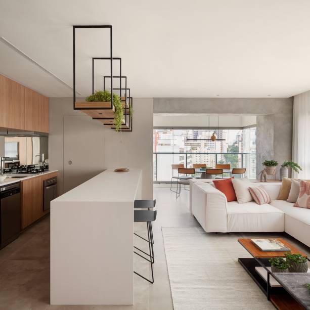 “Como a ideia era integrar e receber pesamos em integrar ao máximo cozinha, sala e terraço e a primeira providência foi pensar num balcão que ao mesmo tempo desse para fazer pequenas refeições e funcionasse como um bar para receber os amigos”, explica o escritório.