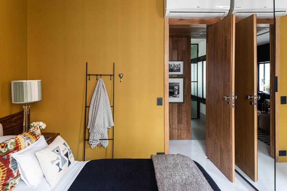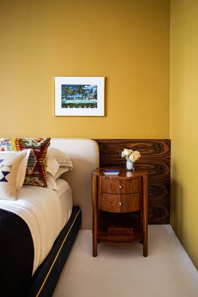 No quarto, as paredes em tom ocre criam uma atmosfera acolhedora, acentuada pela cabeceira de pau ferro e mesa de cabeceira desenhada sob medida. A cama estofada azul marinho, também feita exclusivamente para o cliente, traz um toque de elegância.