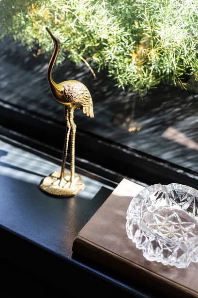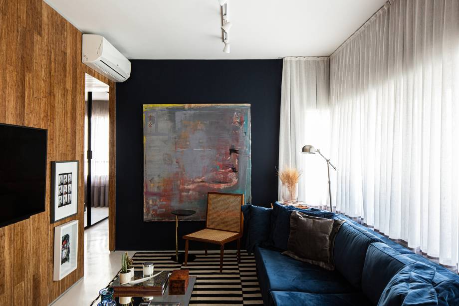 Já a sala ganhou vida com uma parede azul profundo, tapete listrado, móveis de design e obras de arte. “O azul quase marinho adiciona profundidade e um toque de serenidade, proporcionando um ambiente acolhedor e confortável. A cor, conhecida por estimular a mente, traz uma irreverência sutil, criando um espaço despojado e moderno”, explicam os profissionais.