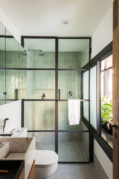 O banheiro ganhou uma marcenaria leve, cuba esculpida em mármore Carrara, piso de porcelanato Pietra Lombarda e revestimento Gouche cor Mer, ambos da Portobello, complementados pelo moderno box em serralheria.