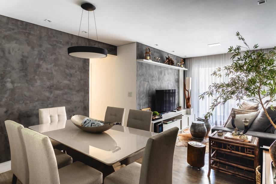 Na sala de estar, onde fica mais evidente a mescla dos estilos, a dupla da Etri Arquitetos planejou um espaço distinto com clima relaxante. Com um rack para a TV, a solução em marcenaria acomoda, em sua extensão, livros, luminárias e demais objetos decorativos com ajuda da prateleira superior que emoldura a face da parede com aparência de cimento queimado.
