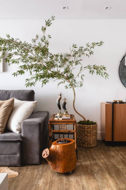 O sofá cinza não foge em nada a proposta do apartamento e dispõe de um degradê de texturas e cores nas almofadas. Além disso, as banquetas de prata adornadas de arabescos indianos e o tapete de pele de vaca acrescentam um toque diferente e, ao mesmo tempo, marcante. “Escolhemos peças que são práticas para o dia a dia e de fácil manutenção.