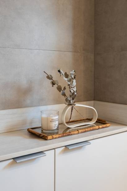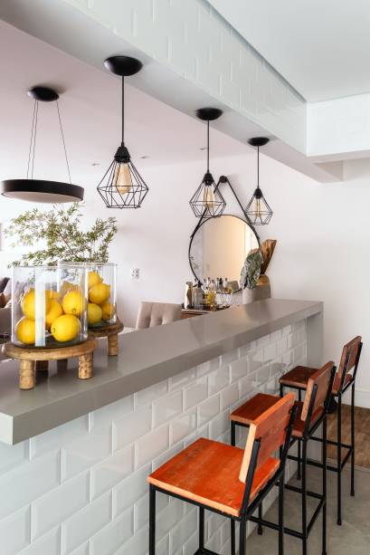 “O cinza foi considerado para promover um certo contraste entre o revestimento da cozinha e a marcenaria branca. Para o toque amadeirado, inserimos três banquetas rústicas para não descaracterizar o apartamento, assim como as portas de vidro do perfil preto”, recordam-se.