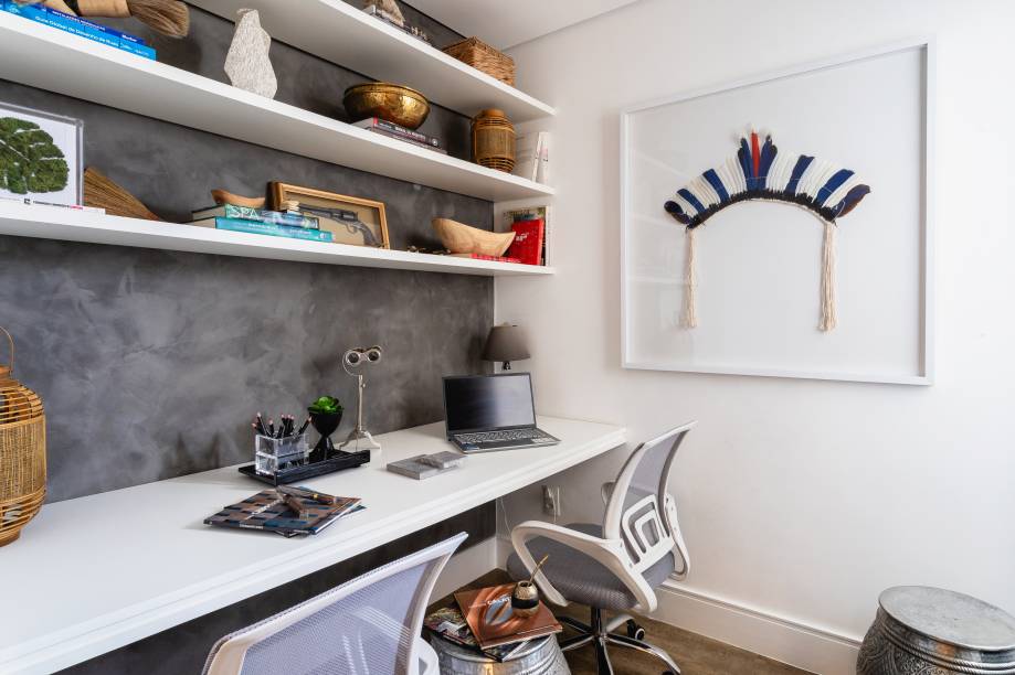 Necessidade fundamental nos dias de hoje, com a marcenaria planejada pelos arquitetos Renata e Eduardo, o segundo quarto foi transformado em home office para as atividades profissionais do morador. Por lá, a iluminação também segue o padrão do apartamento com pontos de luz inseridos no forro de gesso rebaixado.