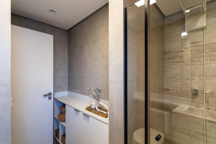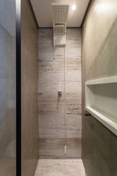O banheiro foi reformado por completo com a intenção de alongar o box, uma vez que na planta original o ambiente era demasiadamente pequeno e desconfortável. Na proposta, o porcelanato com efeito amadeirado patinado deixou a ambientação ainda mais receptiva.