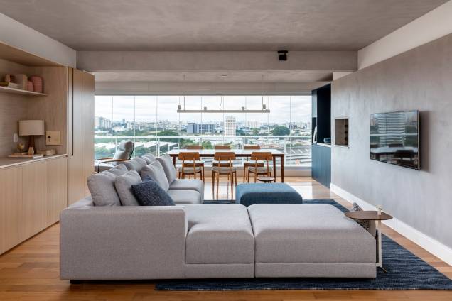 A primeira intervenção foi a integração da cozinha, derrubando a parede que a separava do restante do ambiente. A segunda intervenção foi retirar os caixilhos da varanda, onde foi criada a nova sala de jantar.