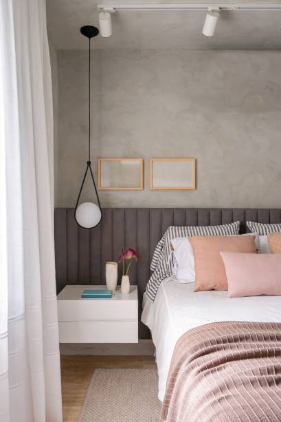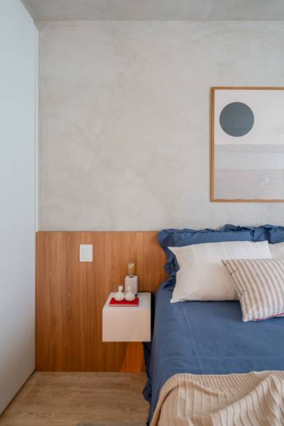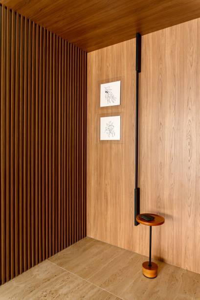 No décor, os arquitetos destacam o corredor de acesso com paredes e teto revestidos em madeira para trazer aconchego, a bancada fixada na parede que também funciona como penteadeira e os tons neutros do décor que transmitem calma e tranquilidade. Todos os tapetes do apartamento são da Hathi.