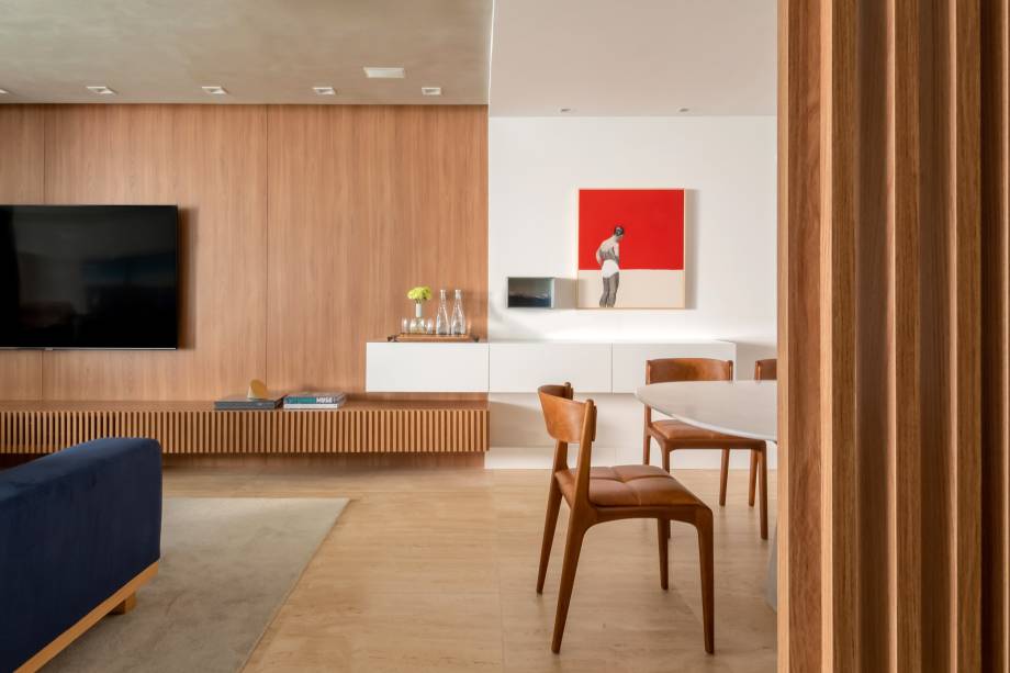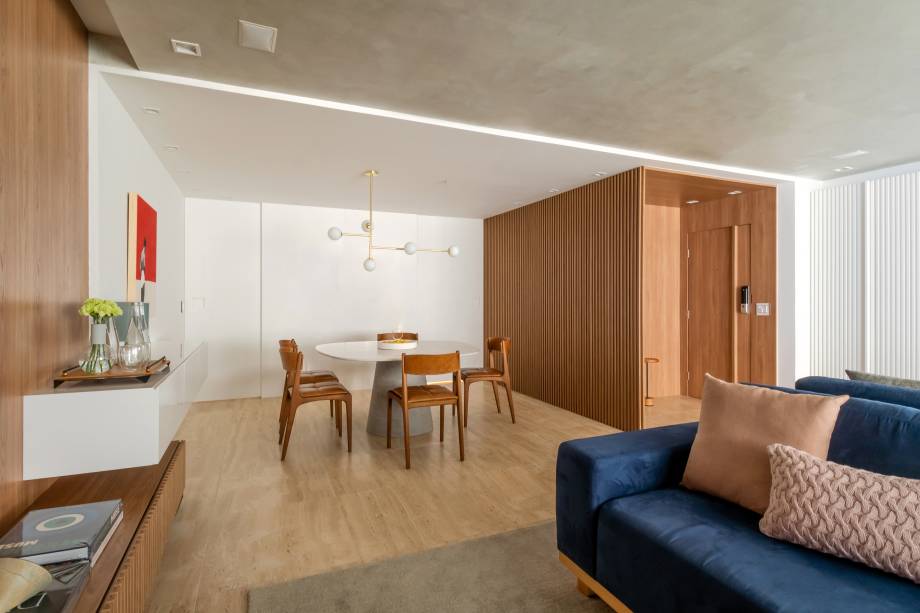 Segundo os arquitetos, a grande sala (com varanda integrada) foi dividida em estar social e sala de tv por um sofá azul, com assentos voltados para os dois lados. Já a sala de jantar é demarcada por um volume branco que contorna as paredes laterais e o teto, e abriga ainda uma grande “caixa” de madeira que delimita o hall de entrada.