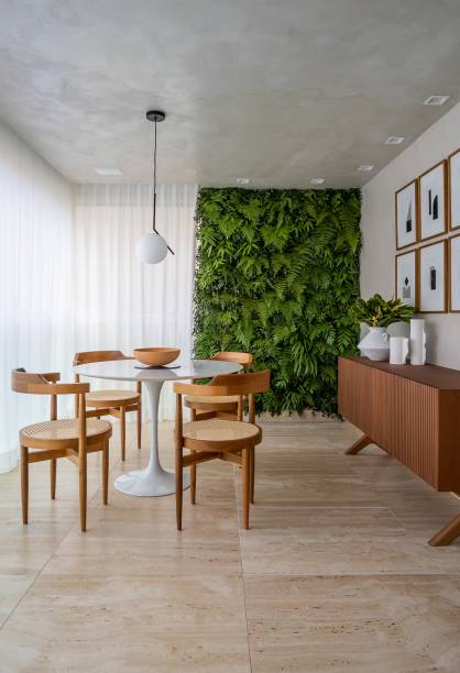 No ambiente de estar, roubam a cena as duas mesas de centro Z (também do Estudiobola) e, na área próxima ao jardim vertical, uma mesa de jantar Saarinen, quatro cadeiras Oca (da Ameise Design) e o bufê Soma (do Estudiobola). Já no quarto da moradora, as peças de destaque são a cadeira Joy (de Jader Almeida) e a luminária pendente Corda (de Guilherme Wentz).