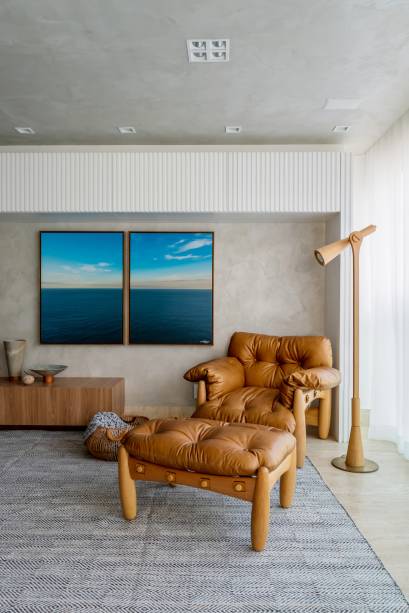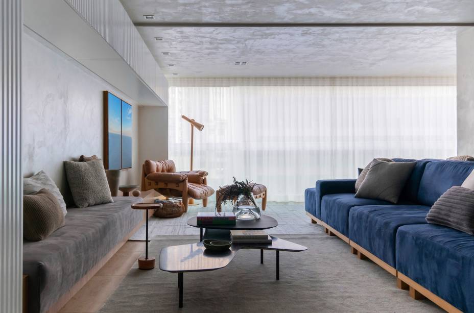 Apesar de estar localizado na quadra da praia do Leblon, o apartamento não tem vista para o mar. Por isso, o escritório apostou em uma base neutra, especialmente o branco e o cimento queimado, para destacar os móveis brasileiros de design assinado e os adornos.