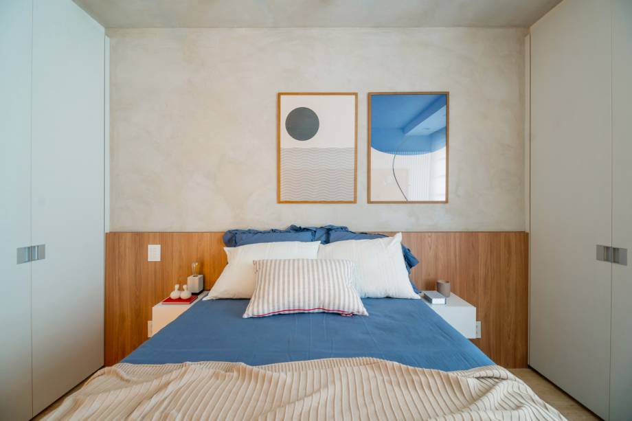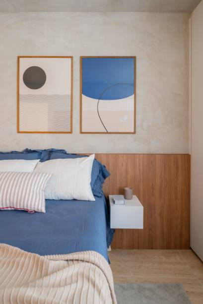 Em alusão ao mar, a cor azul foi eleita para pontuar o décor, presente no estofamento do sofá, na roupa de cama do quarto de hóspedes e em alguns quadros. “No estar, o díptico de fotografias do mar com o horizonte ao fundo simula janelas. No canto da sala, próximo à fachada, o jardim vertical também ajudou a recriar uma atmosfera natural dentro de casa”, explica Sandro.