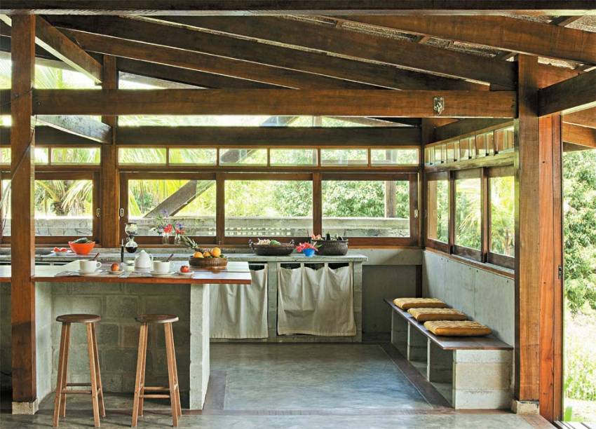 O transporte se mostrou fundamental na definição do projeto, uma vez eleito o lote num platô a 200 m do mar. “Os materiais vinham de São Paulo ou de São Sebastião, chegavam à ilha de traineira, seguiam à praia de canoa e depois eram carregados em três etapas até o terreno. Diante desse trabalhão, optamos por sistemas e peças fáceis de levar”, diz o arquiteto sobre o fato de ter erguido apenas a fundação e as bancadas com concreto e alvenaria. Em todo o restante, ele usou armação de madeira, telhas leves, além de painéis prontos e manta isolante nas paredes. Para cuidar da obra, Fernando chegou a morar na vila, trabalhando a distância por três anos, período em que literalmente colocou a mão na massa e aprendeu como funciona cada item da casa. “No futuro isso será valioso: ele mesmo poderá fazer a manutenção”, avalia Pedro.