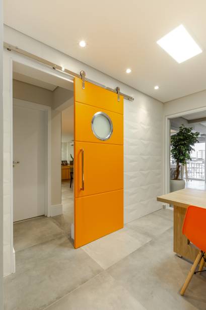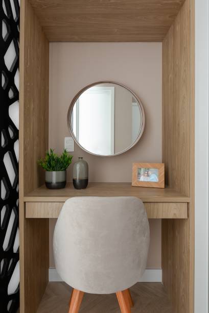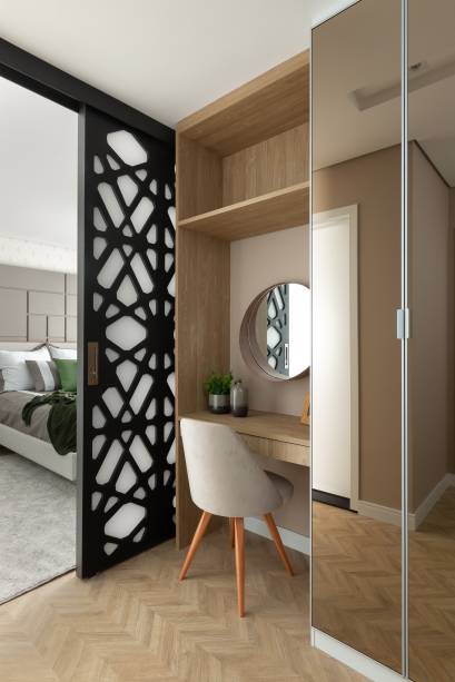 Além da varanda, o projeto da RMV Interiores também realizou uma aplicação no closet da suíte master e no lavabo.