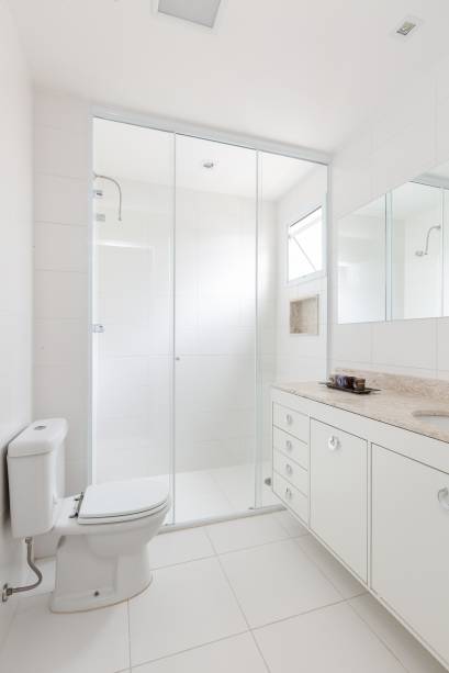 A suíte master combina tons neutros com elementos marcantes, como um painel de TV sobreposto e um recamier em tonalidade vibrante, criando um diálogo entre texturas e volumes. O banho master aposta na continuidade visual dos revestimentos e em soluções que ampliam a sensação de aconchego, como a bancada em mármore Carrarinha e os armários espelhados.