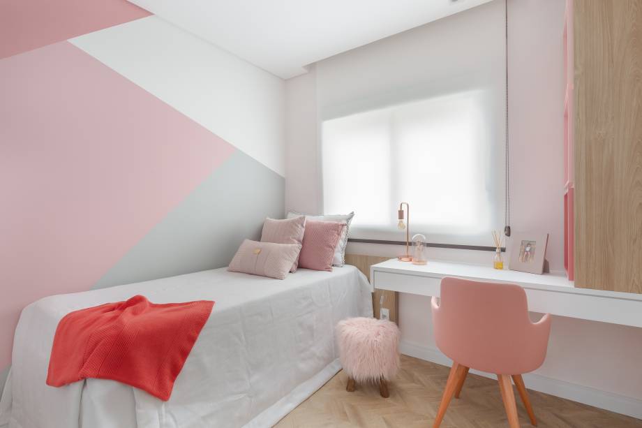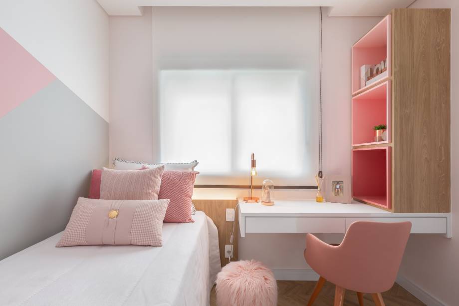 O quarto de Mel segue uma paleta delicada em tons de rosa, cinza e branco, enquanto seu banheiro apresenta textura e contraste com um porcelanato tridimensional e gabinete laqueado.