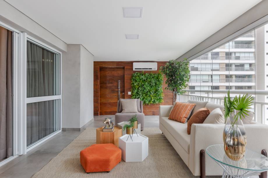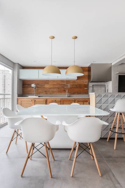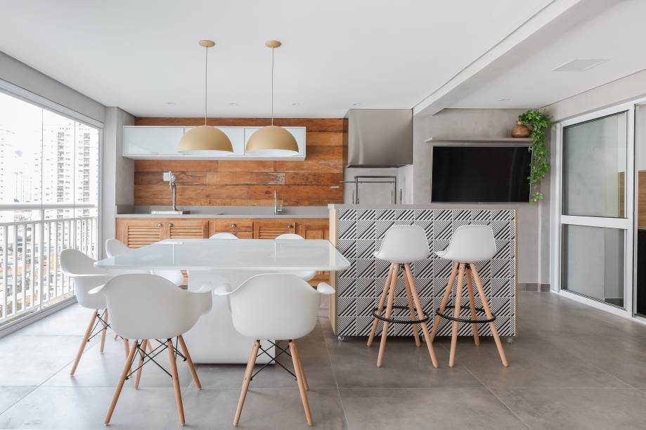 Varanda de apê de 242 m² no Tatuapé tem móveis de madeira de demolição e área gourmet