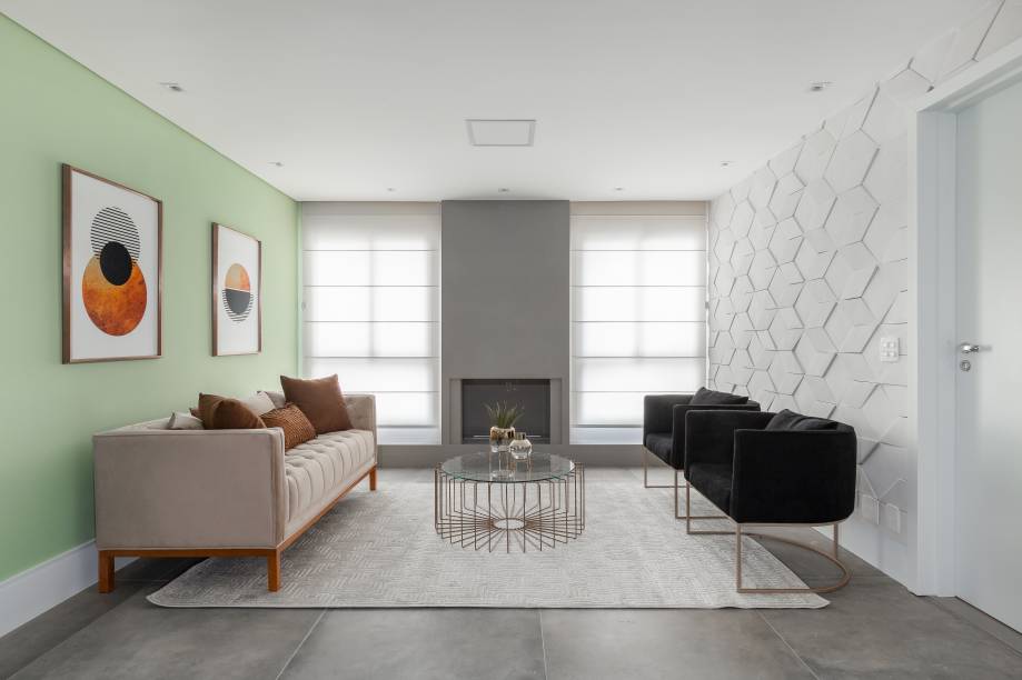 Os quartos infantis exploram cores e composições lúdicas. O quarto de Julia harmoniza verde, branco e preto em uma proposta moderna, com um revestimento geométrico contrastando com papel de parede floral. No banheiro, o grande destaque é a parede em escama de peixe colorida, reforçando a identidade vibrante do espaço.