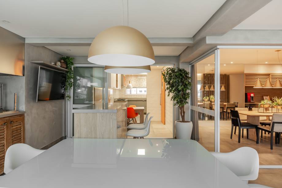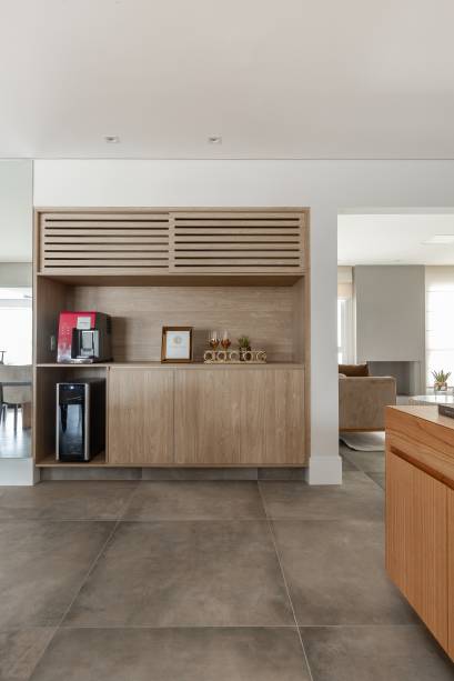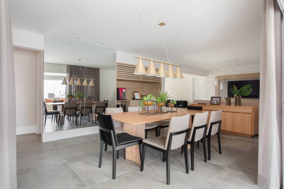 Algumas movimentações estratégicas de alvenaria foram realizadas para otimizar a funcionalidade dos espaços, como a ampliação do closet da suíte master e do lavabo. O conceito adotado equilibra conforto e personalidade, com a madeira como protagonista, presente em diferentes acabamentos — desde a porta de entrada até a mobília e o gabinete restaurado da área gourmet.