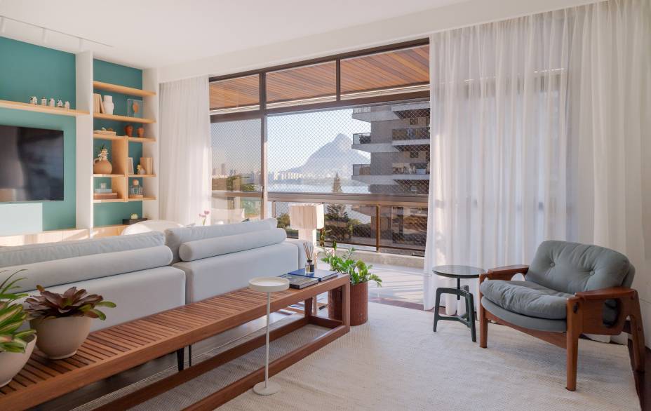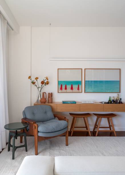 Móveis brasileiros de design assinado – com destaque para o par de poltronas Tetê, de Sergio Rodrigues, e as duas mesas de apoio ao sofá, de Jader Almeida – se mesclam a peças de designers menos conhecidos, resultando em uma mistura eclética, com bossa.
