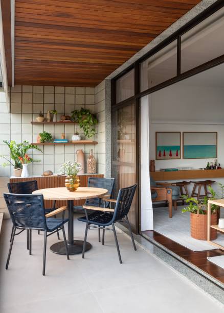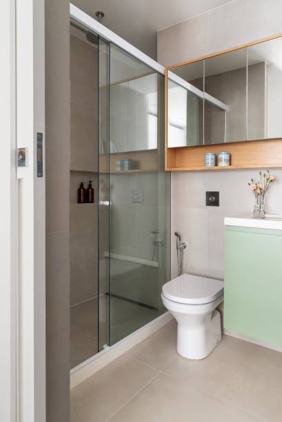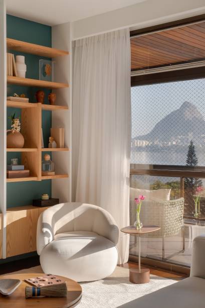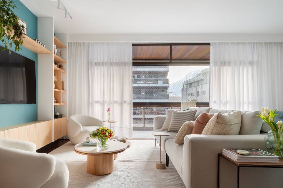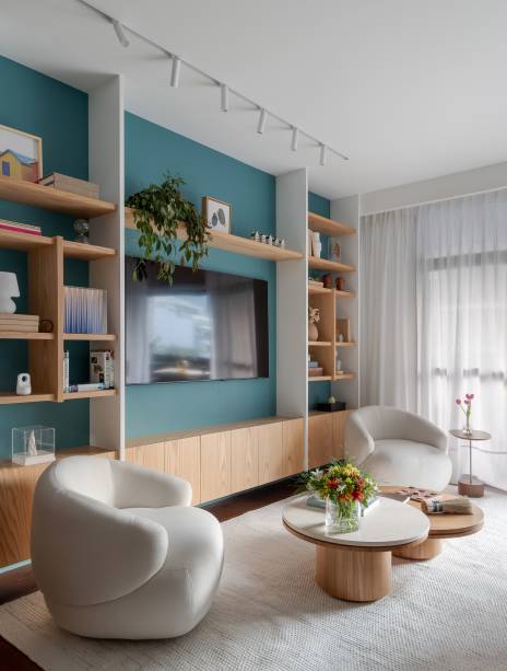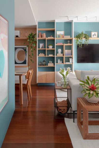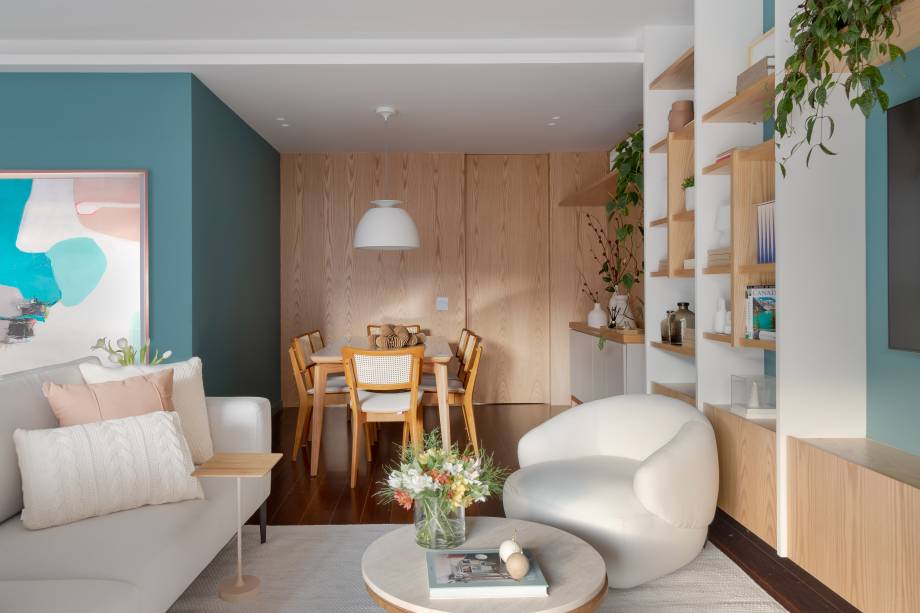 “No geral, adotamos uma paleta de cores em tons de azul e verde, presente nas paredes, móveis, marcenarias e adornos de todos os ambientes do apartamento, exceto o lavabo. Para equilibrar esses tons mais frios, usamos muita madeira natural, especialmente carvalho americano, incluindo o piso existente em réguas de madeira, que foi mantido. Para conferir leveza ao décor, acrescentamos branco e off White”, finaliza a arquiteta Marina Romeiro.