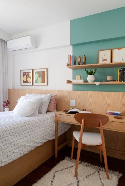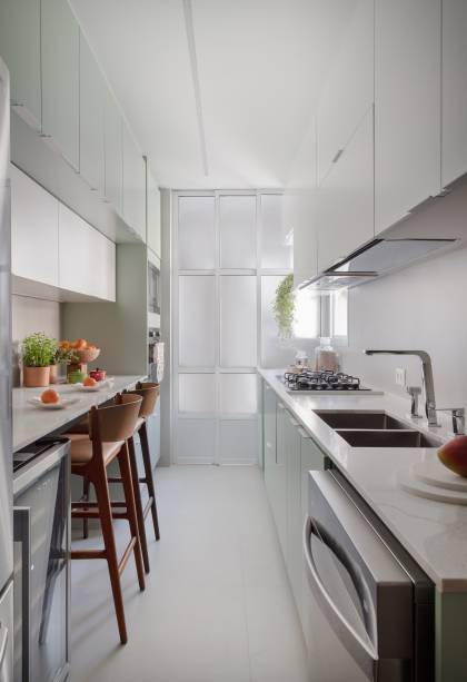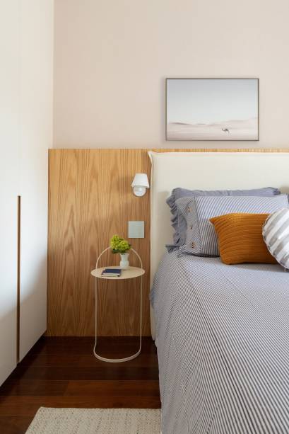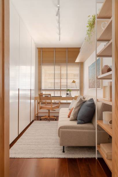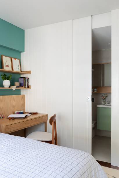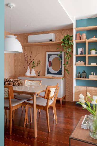 “Como eles queriam um imóvel para viver por muitos anos, tudo foi pensado para tirar o máximo de partido dos espaços e ressaltar suas qualidades. Melhoramos a ventilação natural, criando, por exemplo, uma ventilação cruzada ao alinhar a porta do escritório e a porta que dá para a sala. Também exploramos bastante a textura da madeira, em especial o carvalho americano, mesclando com tons de azul e verde para trazer vida”, informa a arquiteta Marina.
