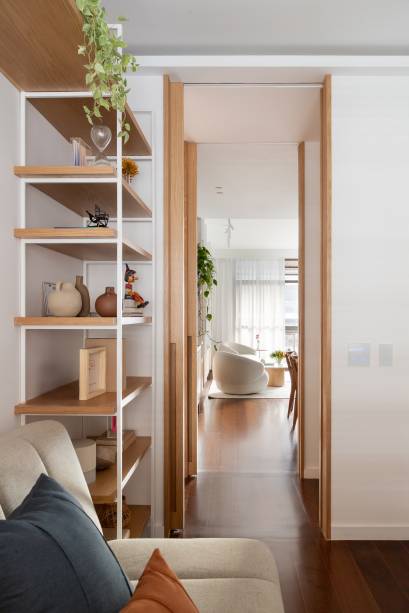 “Eles pediram uma sala confortável, com bastantes assentos e espaços de armazenamento, além de duas suítes e um lavabo, já que na planta original havia apenas uma suíte e um banheiro social,”, conta Marina. “O sonho deles era ter uma casa que os abraçasse, que fosse um refúgio ao final de um dia de muito trabalho”, acrescenta o sócio Felipe.