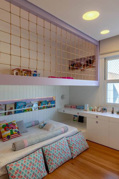 No quarto da filha existe um mezanino com fechamento de corda náutica com arremates de nós de marinheiro. Já no banheiro do casal, um grande vidro fixo dentro do box permite que, na hora do banho, a vista possa também ser apreciada.