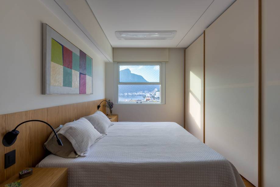 Ao fechar o quarto que estava aberto para a sala, a parede foi recuada de modo a permitir que a estante ficasse embutida e longe da janela. O segundo quarto de serviço foi eliminado, abrindo espaço para duas bancadas na cozinha e criando um banheiro que foi incorporado ao quarto, virando outra suíte além da do casal.