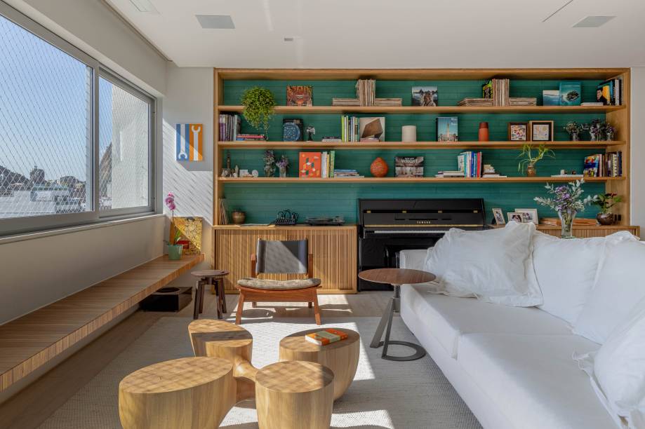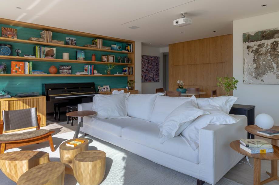 “Como optamos por não ter TV nos quartos, queríamos ter uma grande na sala, para assistir filmes, séries e ver esportes. Porém o layout não ajudava, como colocar uma TV na frente da janela? Tivemos então a ideia de ter um telão com projetor embutido no teto. Pronto! Todos adoraram, especialmente a pequena que agora tem um cinema com pipocas em casa”, diz.