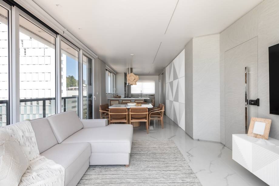 Com uma estética clean, o projeto ganhou uma paleta de cores suave, com toques de madeira para aquecer. Os revestimentos presam pela praticidade sem deixar de lado a estética: no piso, o porcelanato de grande formato garante a unicidade visual; a parede da sala de estar e detalhes da área gourmet são revestidos por um MDF texturizado, que remete o movimento da areia da praia.