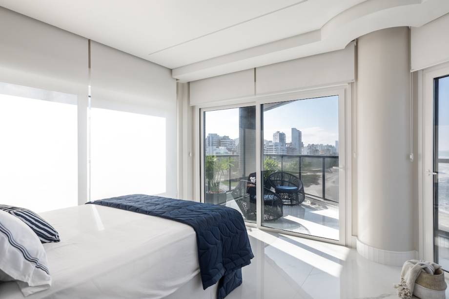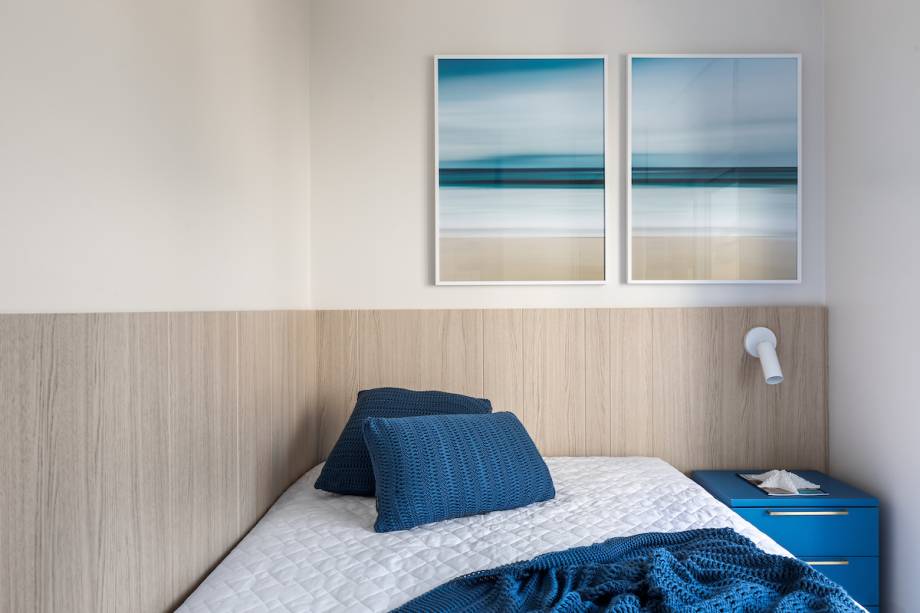 Na área íntima, a suíte principal ganha toques de azul que fazem alusão ao mar, além do painel madeirado que sobe de trás da cama até o teto. Um cantinho de leitura faz divisão com a sacada, que também dá vista para a paisagem litorânea.