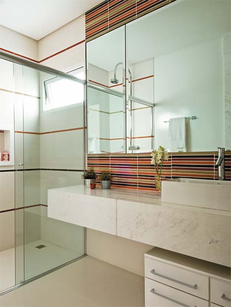 O contraste pode ser interessante e não há nada que impeça o uso. Se os revestimentos tiverem a mesma cor e o mesmo tamanho, podem ser paginados juntos, independentemente das texturas, opina Marlon Gama. Sobre a composição de piso e parede, não é obrigatório tudo casado. Antes, havia a preocupação de o rejunte do piso ser contínuo ao da parede. Hoje, especialmente com a retificação, isso não se faz necessário, comenta Christiane Alves Ferreira, coordenadora de marketing e produto da Portobello, de Tijucas, SC.