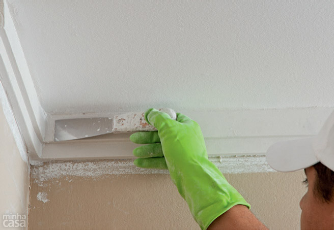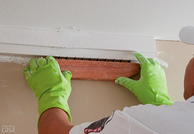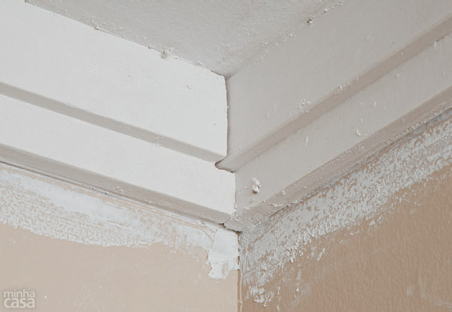 Fique com a dica do especialista Ulisses Militão: o bom resultado da execução é conquistado com o gesso ainda úmido. Por isso, compre-o 24 horas antes ou até mesmo no dia da colocação. “A peça seca corre o risco de empenar”, alerta. Outra medida esperta é raspar o verso e as laterais das baguetes antes de assentá-las. Isso porque os fabricantes untam a superfície para impedir que o gesso pronto grude na mesa onde é confeccionado. “Ao desgastá-las, elimina-se essa proteção e obtém-se mais porosidade, fator importante para a aderência da cola”, explica o gesseiro. E cuidado com o manuseio, visto que os modelos se quebram facilmente. Por fim, saiba que, após a instalação, será preciso repintar o cômodo, pois a massa que fixa as molduras, assim como a tinta que lhes dá acabamento, certamente mancharão o teto e as paredes.