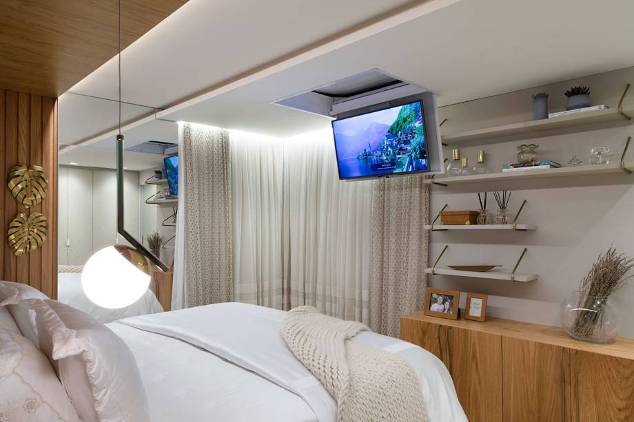 A suíte master possui uma variação encantadora de texturas em tons de fendi, que vai dos painéis e armários com portas estofadas às tramas das cortinas. Para trazer mais calor a esse ambiente, foi usada uma moldura de madeira carvalho envolvendo a cama do casal, resultando em um quarto que “abraça”.