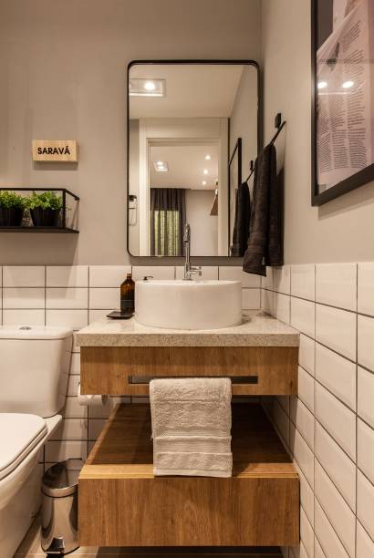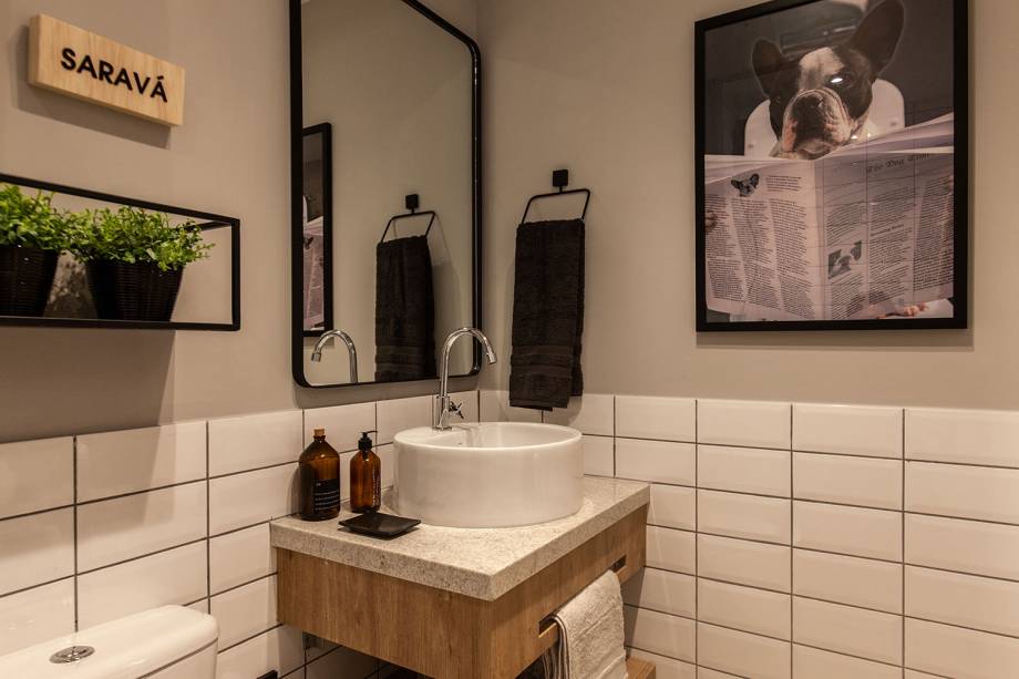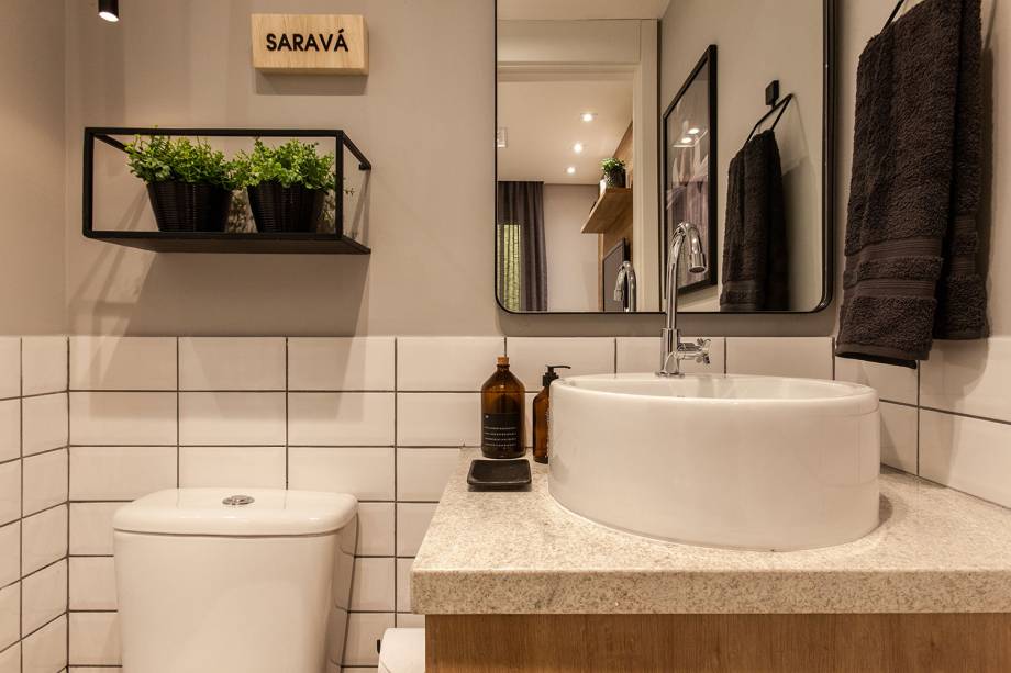 Mas o queridinho do projeto é o banheiro que, por ser o único do lar, acaba funcionando também como lavabo. “Usamos o tijolinho branco com rejunte escuro para deixar mais descolada a proposta. Escolhemos ele por ter um ótimo custo benefício e acrescentamos objetos decorativos para valorizar a proposta”, explicam.