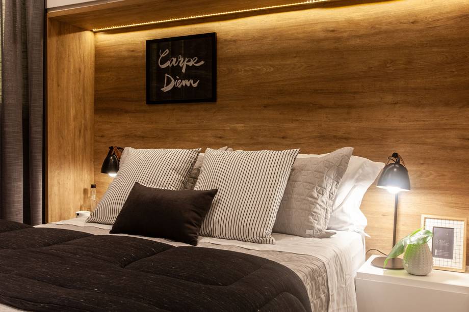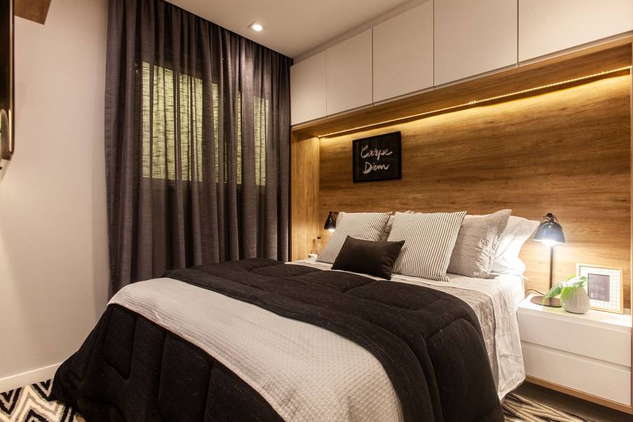As profissionais apostaram em uma mesma linguagem no apartamento inteiro, que, segundo elas, é fundamental para imóveis diminutos. Assim, vemos as mesmas características decorativas da área de convivência no dormitório do casal. Uma das apostas para não “enclausurar” o quarto, foi investir no armário acima da cama.